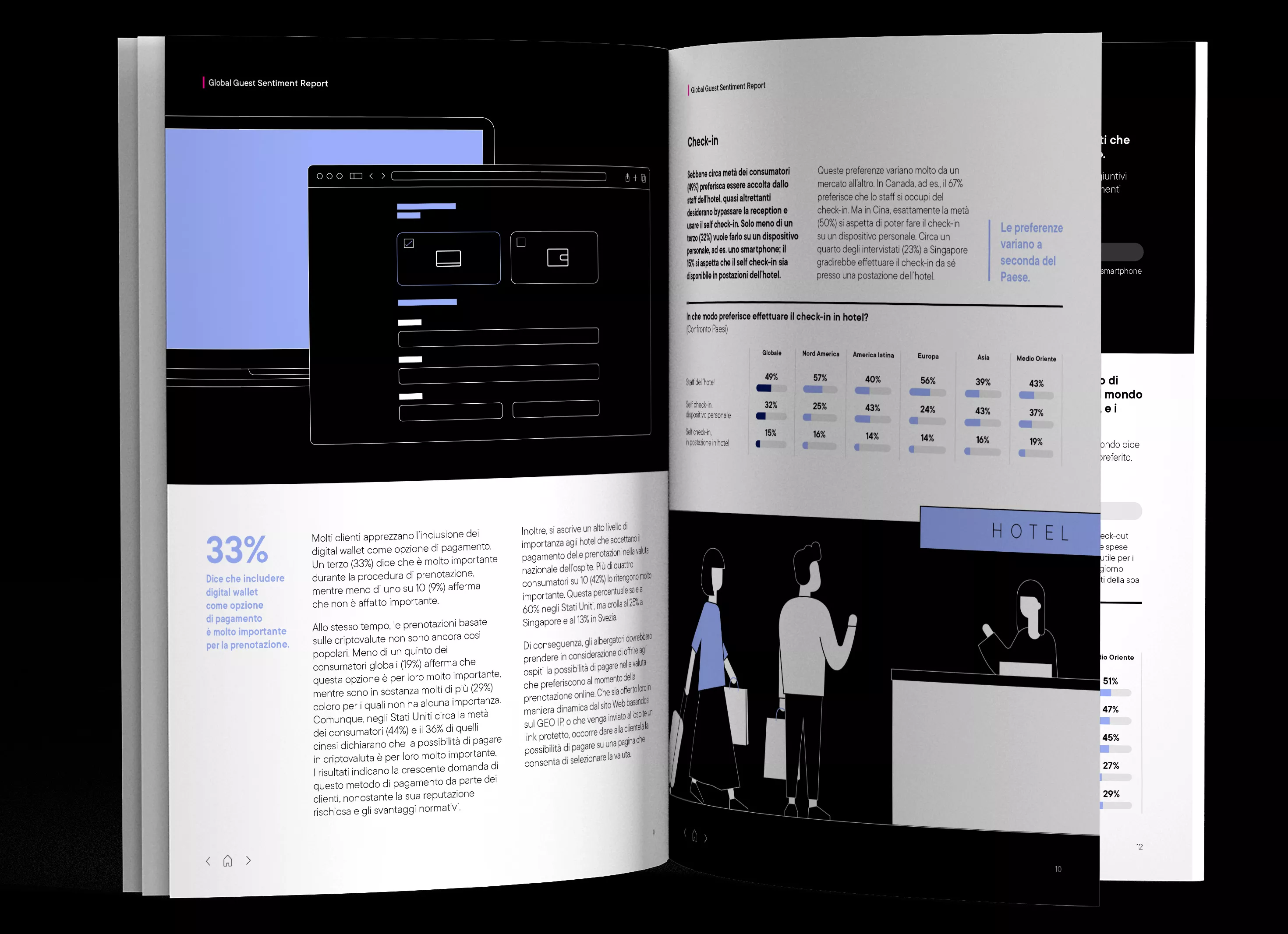 ​​​​​​Dati globali, regionali e locali: analisi di ciò che rende eccellente l'esperienza dell'ospite sia online che in loco, di come gli ospiti scelgono di prenotare, effettuare il check-in/out e di cosa si aspettano in caso di ritorno, nonché delle preferenze generali in materia di pagamenti, valuta, sicurezza, Wi-Fi e TV.