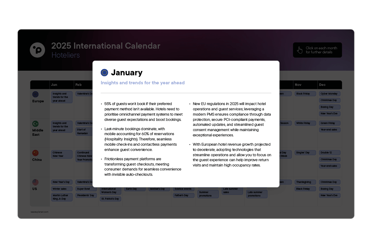 Stay ahead in the hospitality industry by planning for key dates and events throughout 2025. This interactive calendar provides valuable insights into past trends, guest expectations by region, and expert recommendations to help you optimise operations and maximise revenue. It equips hoteliers with the tools to strategically plan bookings, enhance guest experiences, and drive profitability throughout the year.